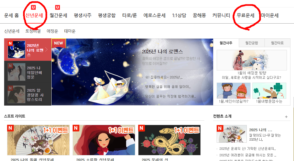 다음 사이트 검색창에서 2025년 무료 운세 보기를 검색하시면 네이트의 아래 화면으로 이동됩니다. 운세홈에서 신년운세 무료 운세를 클릭하시면 다양한 운세 정보를 확인할 수 있어요.